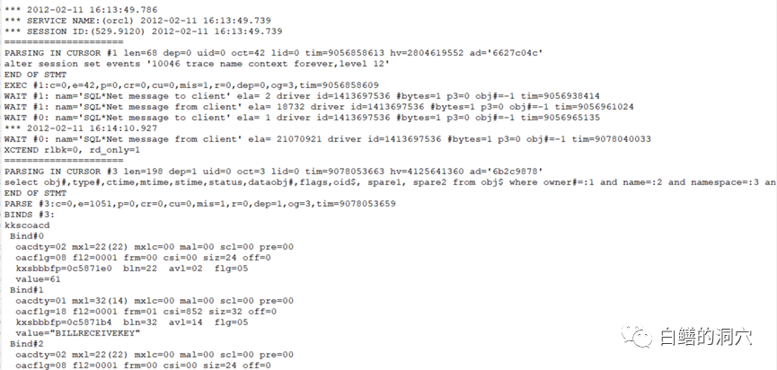 10046 trace可以把SQL执行的黑匣子打开,让DBA知道一条SQL是如何执行的,调用了哪些递归调用,执行过程中扫描了哪些数据块,扫描效率如何,哪些地方产生了等待。另外还可以看到SQL的完整执行计划,了解SQL的执行计划是否出现了问题。