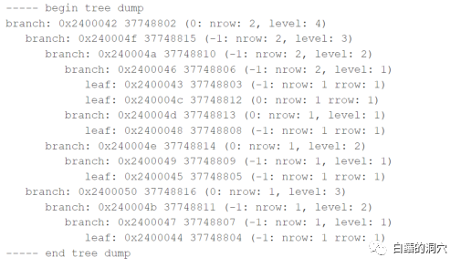 我们可以在会话上直接DUMP某个索引的树结构,参数是需要dump的索引的OBJECT ID。今天早上我没时间做实验了,所以直接从网上找了一个数据展示给大家: