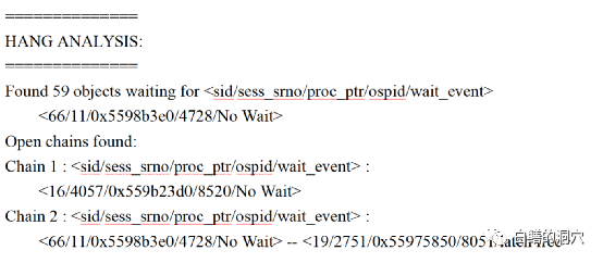 我贴的这张图已经比较老了,是十多年前的,现在的HANGANALYZE REPORT的可读性要好了很多。不过从老版本的报告中我们也很容易发现系统中出现的一场等待。