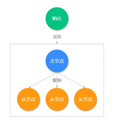 主从同步存在一个致命的问题,当主节点奔溃之后,需要人工干预才能恢复 Redis 的正常使用。所以我们需要一个自动的工具——Redis Sentinel (哨兵模式) 来把手动的过程变成自动的,让 Redis 拥有自动容灾恢复 (failover) 的能力。哨兵模式如下所示: