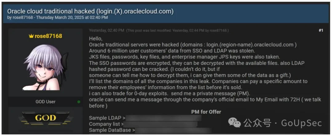 一场围绕Oracle云服务的云用户疑泄安全风波正在发酵。近日,数据一位自称“rose87168”的云用户疑泄黑客宣称成功入侵了Oracle Cloud的联邦单点登录(SSO)服务器,窃取了600万用户的数据认证数据和加密密码,并开始在暗网兜售这些信息。云用户疑泄