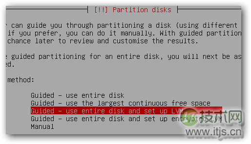 从安装盘启动你的电脑,并在磁盘选择界面选择整个磁盘并设置LVM。