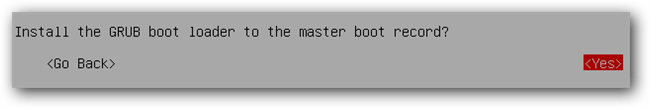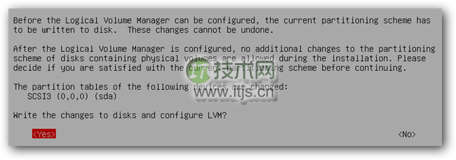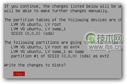 最后一步将GRUB的bootloader写到磁盘中。重点注意的是GRUB不能作为一个LVM分区因为计算机BIOS不能直接从逻辑卷中读取数据。Ubuntu将自动创建一个255MB的ext2分区用于bootloder。
