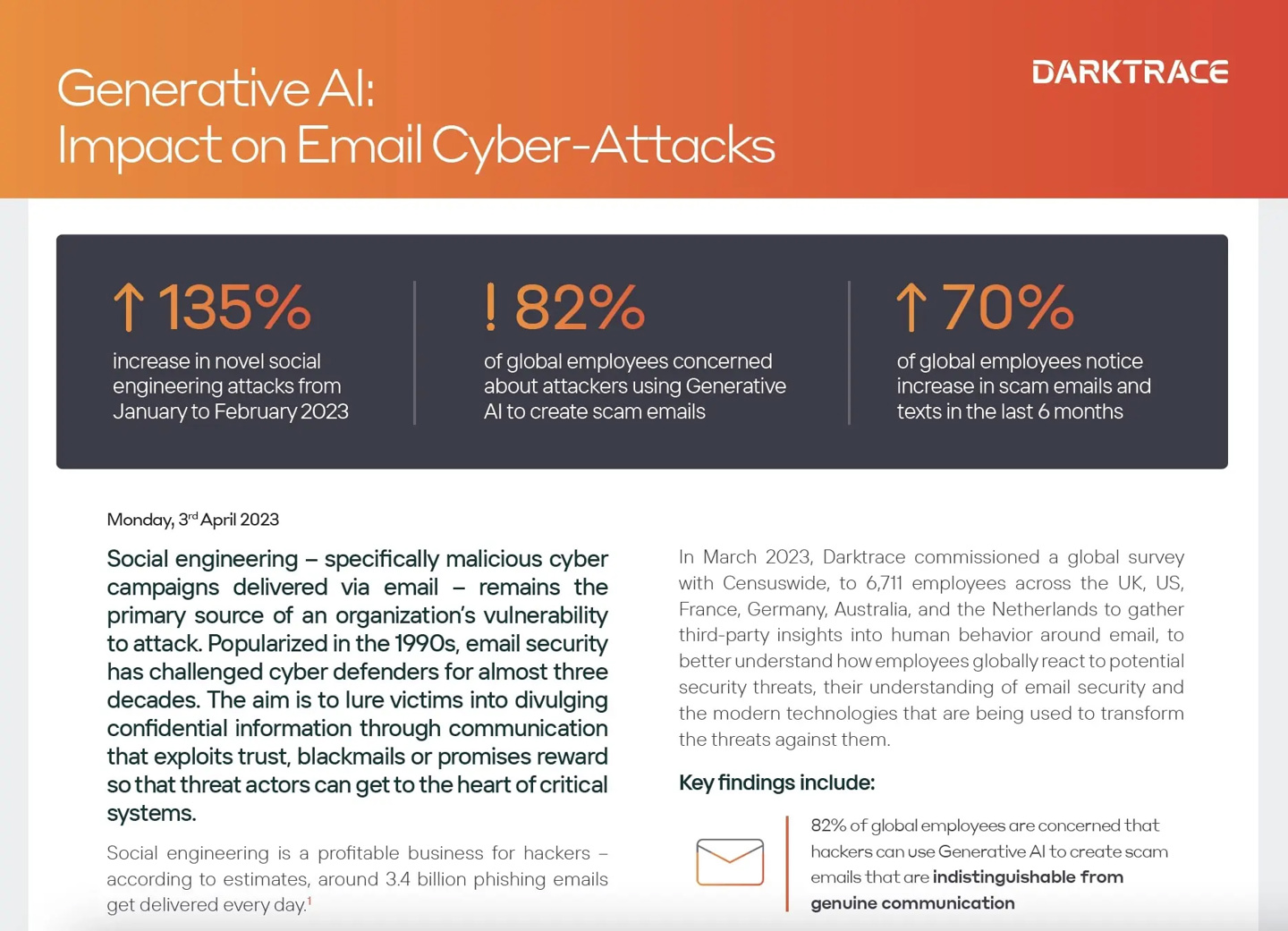 4 月 4 日消息,报告根据网络安全公司 Darktrace 公布的称C成式最新研究报告,攻击者使用 ChatGPT 等生成式 AI,等生导致钓鱼通过增加文本描述、网络标点符号和句子长度,邮件让社会工程攻击量增加了 135%。攻击