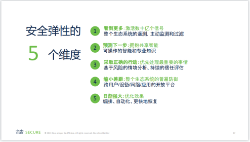 企业该如何提升安全弹性?为此,思科建议企业客户重点从五个维度来提升安全弹性:第一,要能够可视化监测整个网络安全的基础架构;第二,要具有预测的能力;第三,优先处理最重要的事情,其中包括持续的“零信任”评估,基于风险的分析等;第四,在关键的领域缩小差距;第五,要具备快速恢复能力。