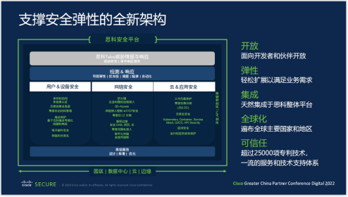 卜宪录表示,思科会“以不变应万变”,帮助企业提升安全弹性。为此,思科提出支撑安全弹性的全新架构,从用户身份、设备安全、网络安全、云应用和数据这五个层面分成三大类别,并且围绕SASE、多云安全、零信任、XDR等提供相关解决方案和产品,帮助企业构建安全弹性的能力,从而提升安全弹性。