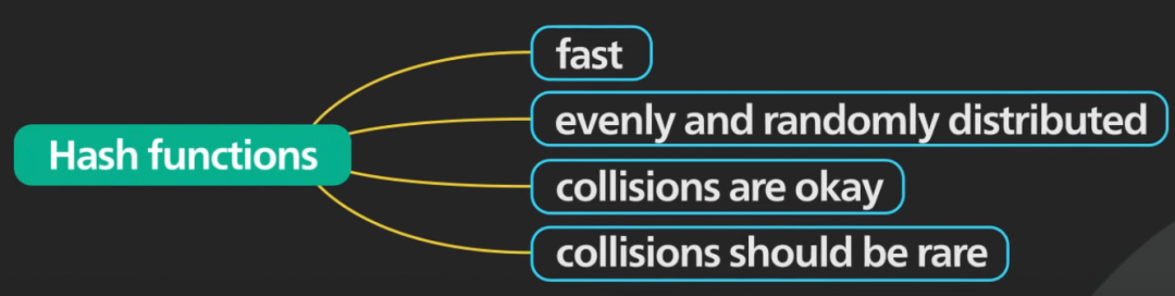 这些哈希函数应该快速,并且它们应该产生均匀且随机分布的输出。只要碰撞很少,就没关系。
