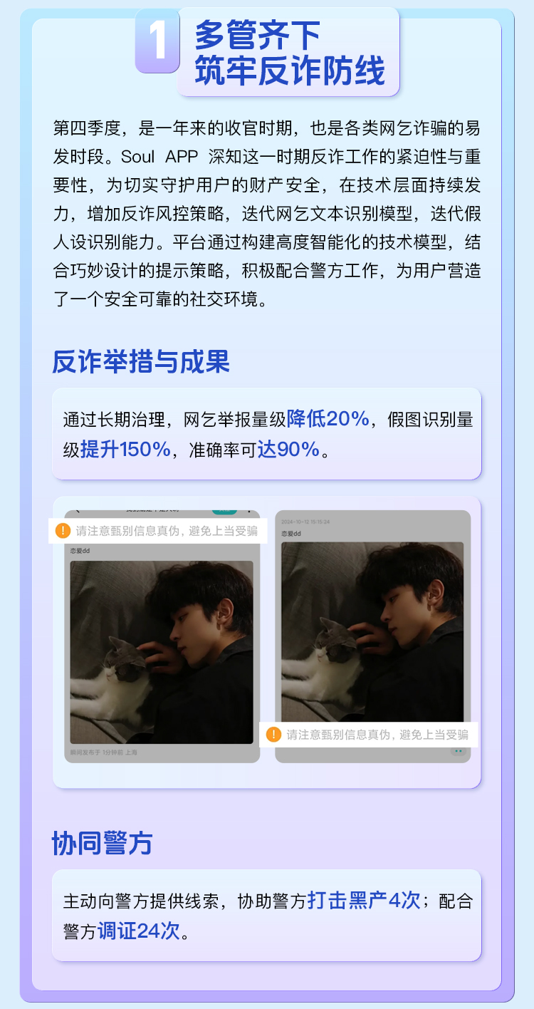在技术层面,生术赋守护社交Soul App持续发力,增加反诈风控策略,迭代网络诈骗文本识别模型和假人设识别能力。通过构建高度智能化的态安技术模型,平台能够精准识别各类诈骗行为,并结合巧妙设计的提示策略,及时向用户发出预警。同时,全报Soul App积极与警方合作,主动提供线索,协助警方打击黑产4次,配合警方调证24次,为打击网络诈骗犯罪提供了有力支持。