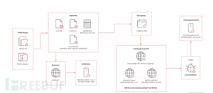 批处理文件启动了一个多阶段的攻击链,其中 Lua 脚本连接到命令与控制(C&C)服务器,下载附加负载,并通过计划任务建立持久性。