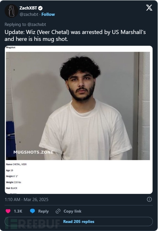 ZachXBT最新发布的加密金额推特公布了切塔尔的入狱照,确认了逮捕消息。这起备受关注的案件由此取得重大进展。通过ZachXBT的调查,公众得以了解维·切塔尔在攻击初期就入侵了受害者个人账户的IT技术网事实。