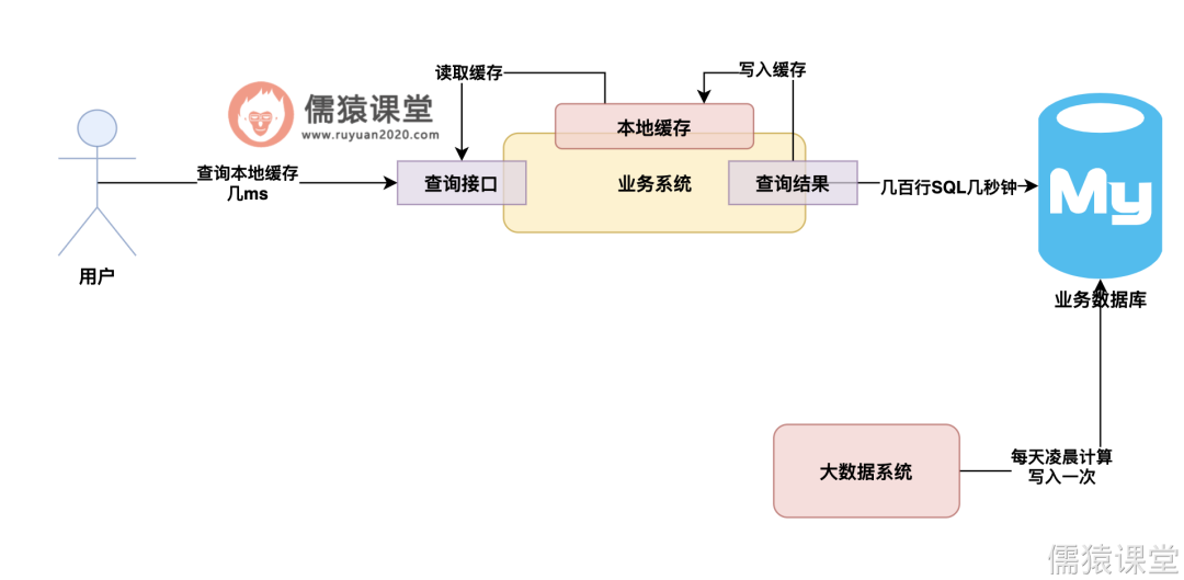 啥叫做离线计算呢?就是说可能有一个大数据系统每天凌晨的时候会把昨天的数据算一遍,算好的数据结果写入到 MySQL 里去,然后每天更新数据就这一次,接着当天就不更新数据了。