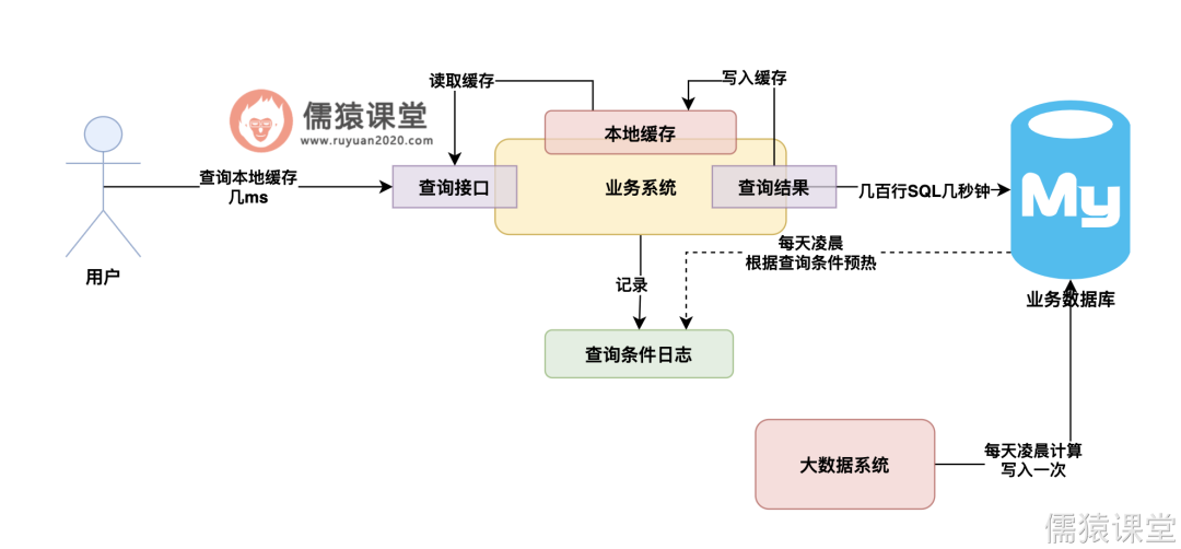 那么下一个问题又来了,很多查询他可能当天第一次查的时候,本地缓存里是没有的,还是得去 MySQL 里花费几秒钟来查询,查完了以后才能放入到本地缓存里去,那这样岂不是每天都有一些人第一次查询很慢很慢吗?