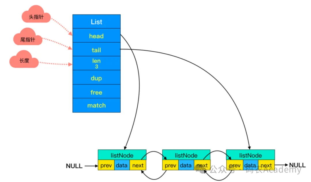 复制typedef struct list { listNode *head; // 头节点指针 listNode *tail; // 尾节点指针 unsigned long len; // 链表长度 // 其他字段... } list;1.2.3.4.5.6.从结构中可以看出元数据中还有两个特殊的节点:头节点(head node)和尾节点(tail node),它们分别位于链表的头部和尾部。而他们的作用如下: