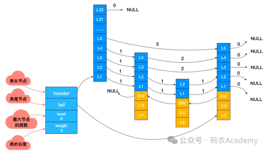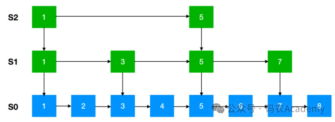 跳跃表通过维护多级索引,每个级别的索引都是原始链表的子集,用于快速定位元素。每个节点在不同级别的索引中都有一个指针,通过这些指针,可以在不同级别上进行快速查找,从而提高了查找效率。