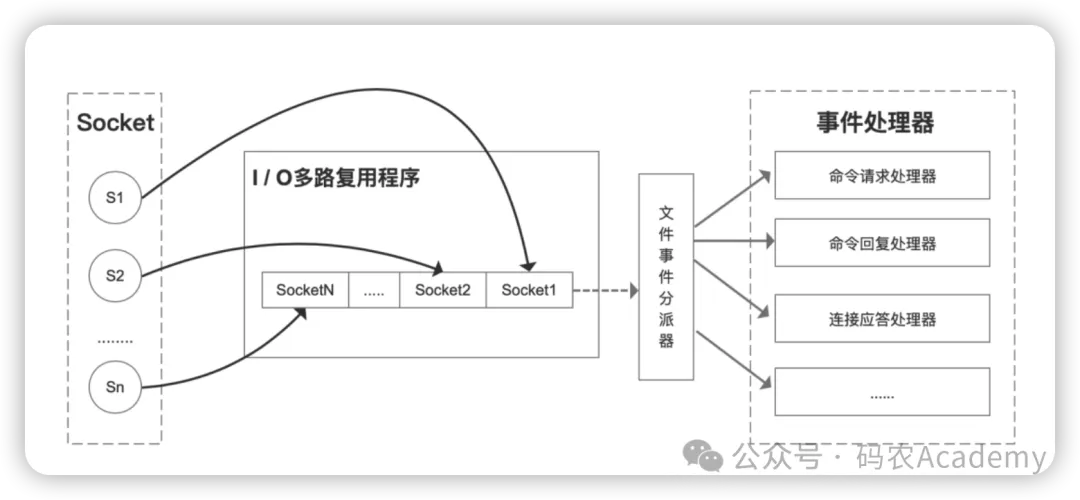 IO多路复用技术:Redis通过使用IO多路复用技术(如epoll、kqueue或select等),在一个线程内同时监听多个socket连接,当有网络事件发生时(如读写就绪),再逐一处理。这样可以处理大量并发连接,并在单线程中高效地调度网络事件,使得单线程也能应对高并发场景。所以Redis服务端,整体来看,就是一个以事件驱动的程序,它的操作都是基于事件的方式进行的。Redis的事件驱动架构如图: