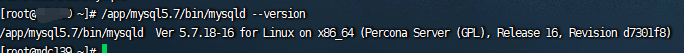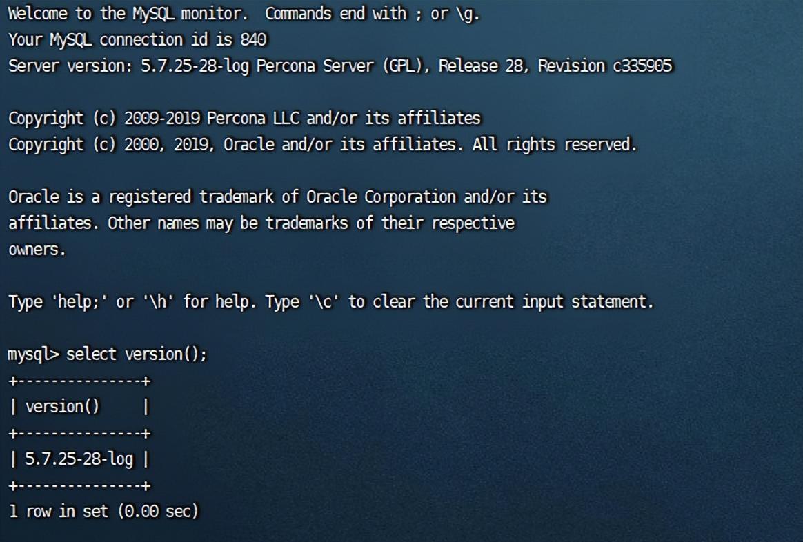 复制[ops@ck2 ~]$ /usr/local/mysql5.7/bin/mysqld --version/usr/local/mysql5.7/bin/mysqld Ver 5.7.25-28 for Linux on x86_64 (Percona Server (GPL), Release 28, Revision c335905)1.2.但是登录数据库中查看版本: