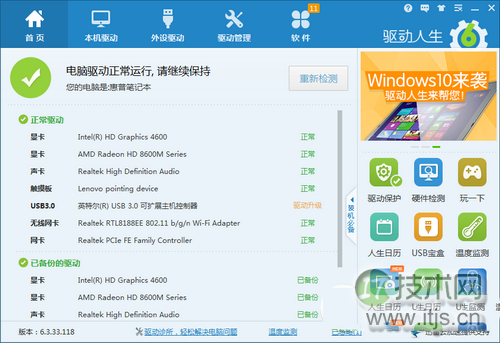 重启电脑后,再打开驱动人生软件检测一次,从界面即可查看到,触摸板驱动已正常,建议用户在本机驱动里,把电脑驱动都备份一下,假如驱动异常或丢失,可以更快捷进行修复。