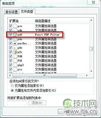 单击“高级”按钮,打开“高级选项”对话框的“文件类型”选项卡;再分别勾选的“PDF”复选框和下端的“为属性和文件内容添加索引”单选框;最后单击“确定”按钮,系统就可以开始对F盘执行索引的WordPress模板建立操作了。