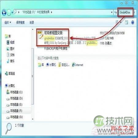 经过以上步骤的操作,当我们打开F盘的根目录并在Windows窗口的搜索框中以某个关键词(如“Grub4Dos”)执行搜索操作时,很快就可以搜索到内容符合搜索条件的PDF文档了。