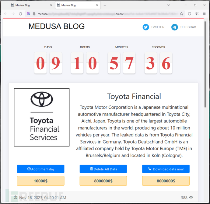 参考文章:https://www.bleepingcomputer.com/news/security/toyota-confirms-breach-after-medusa-ransomware-threatens-to-leak-data/