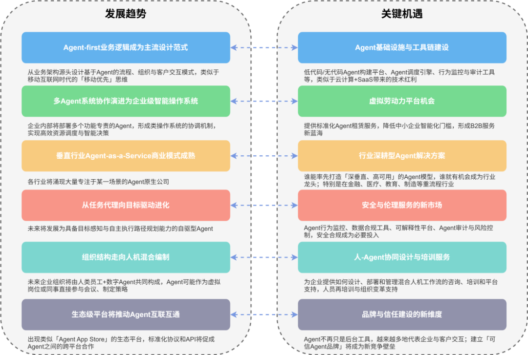 随着技术成熟与应用场景拓展,原业以智能Agent为核心构建业务流程、生企组织架构与产品服务的发展原生企业将会迎来一个高速增长期——这些企业将崛起于各行各业,并展现出高度的趋势敏捷性、自适应性与创新能力,机遇成为引领产业变革的原业新兴主体。未来,生企Agent原生企业将会有哪些发展趋势与机遇呢?发展