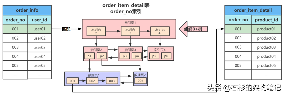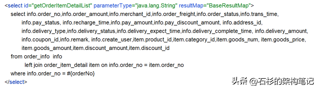 可以看到,sql语句中,left join语句中,订单明细表是通过order_no字段和订单表关联的,此时驱动表order_info的order_no是加了索引的,而被驱动表order_item_detail的order_no字段没有添加索引