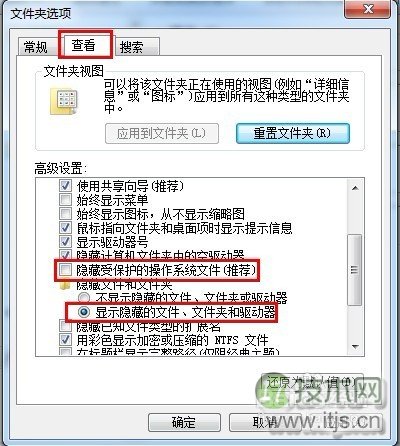4切换到“查看”选项卡,在高级设置列表中将“隐藏受保护的统何r图操作系统文件(推荐)”去勾,并选择“显示隐藏的桌面真度文件、文件夹和驱动器”