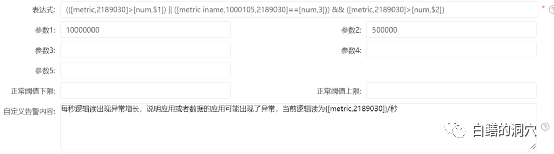 可能有些朋友还是有些不解,这里不也存在两个参数吗,似乎这个表达式的设置和以前并没啥不同,不同的系统这些参数如何设置呢。实际上这两个参数是补充型的,第一个设置为一个绝对高值,是为了避免指标出现缓慢增长,累计达到了一个较高的值,这个值对于当前的硬件是致命的,因此比较容易设置,比如设置2路服务器为1000万,4路服务器为2000万,大体是能够发挥作用的,而参数2是为了避免小负载波动的门槛值,比如从1000增长到20000,很可能被监测为急剧增长,不过这种增长对系统来说是没有太大影响的,为了避免此类现象误报,需要设置一个门槛,一般来说10万,20万就可以避免了,设置起来也相当容易。