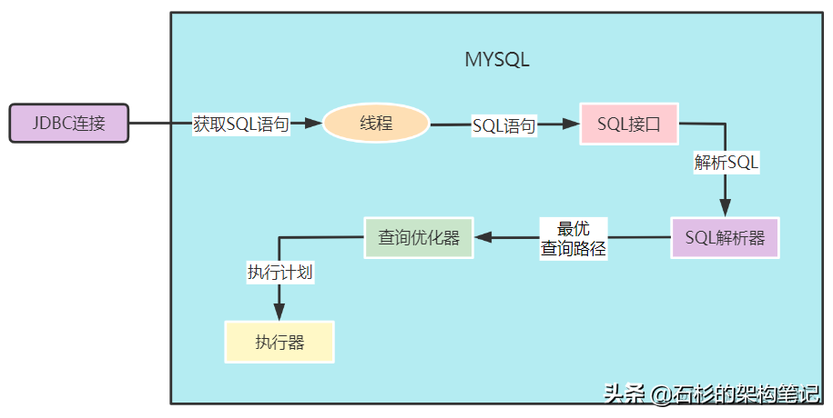 我们来看一下,在MYSQL数据库中是如何执行一个sql语句的,如下图: