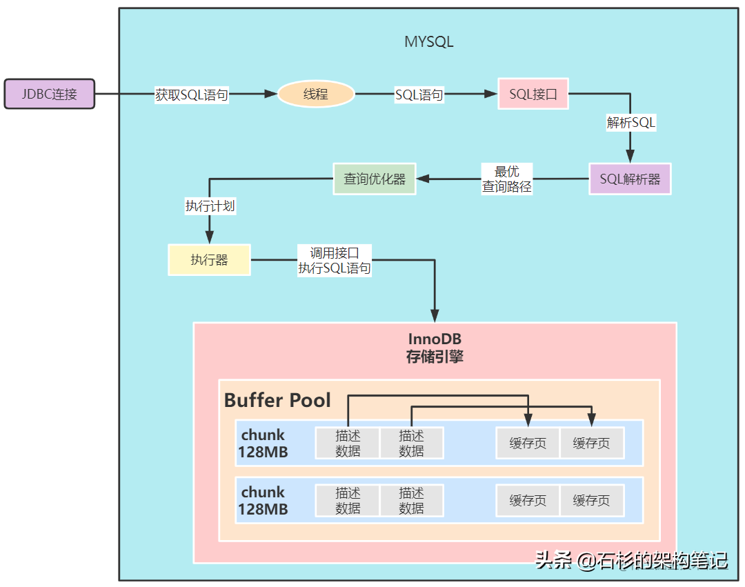 可以看到,MYSQL InnoDB存储引擎中,有一块内存区域叫做Buffer Pool,也叫做缓冲池,一般情况,MYSQL的数据都存放在磁盘中,如果你去查询数据,数据就会从磁盘加载到MYSQL内存中,也就是放在缓冲池Buffer Pool中。