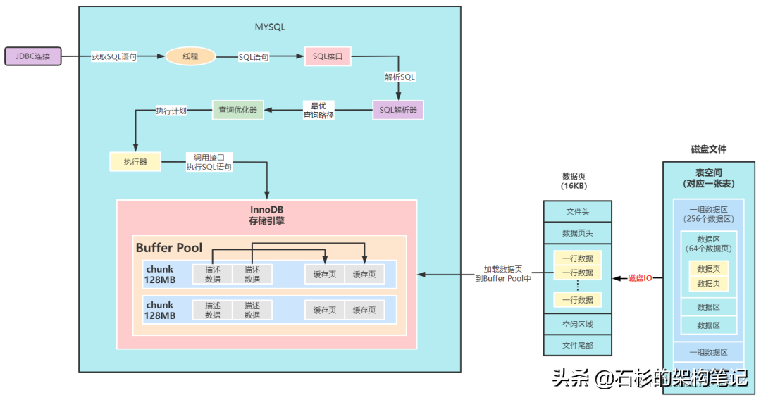从磁盘加载数据到MYSQL内存中,其实就是通过磁盘IO的方式,把数据页中的数据加载到缓冲池Buffer Pool中的缓存页中,然后通过InnoDB存储引擎和sql接口,一步步返回给用户。