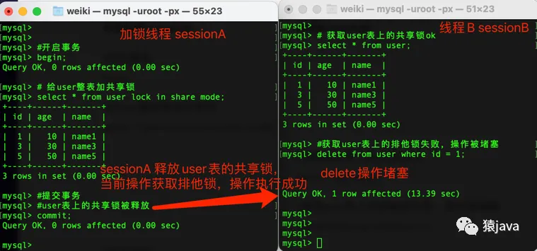 commit;#获取 user 表上的排他锁成功,delete 操作执行 ok