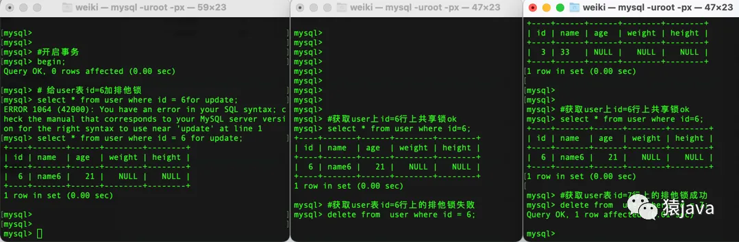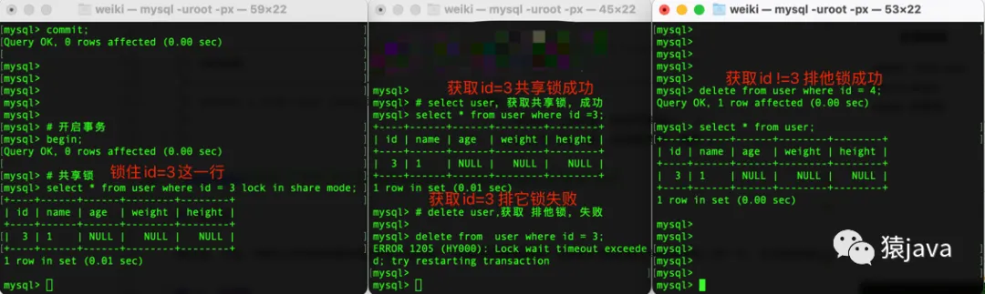 commit;#获取 user 表 id=3 行上的排它锁成功