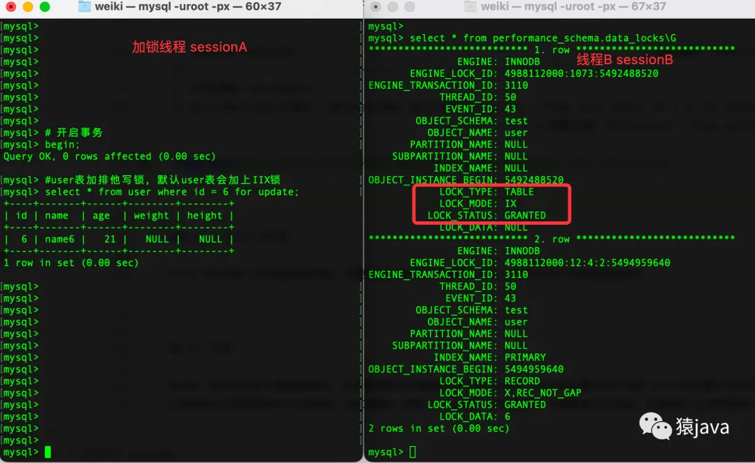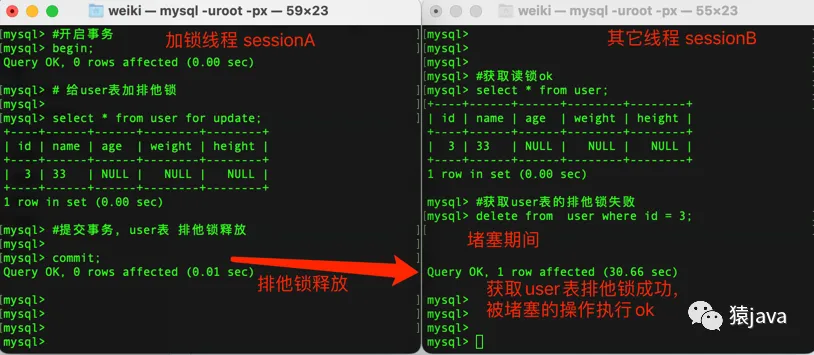 commit;#获取 user 表上的排他锁成功,操作执行 ok
