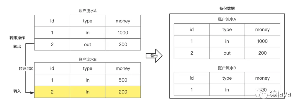 从上述分析可以看出,使用全局锁进行数据备份,不管是在主库还是在从库上进行备份操作,对业务总是不太友好。那不加锁行不行?我们可以通过下面还钱转账的例子,看看不加锁会不会出现问题: