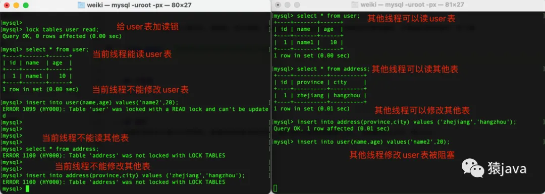 复制# 给表加写锁 lock tables tablename write; # 给表加读锁 lock tables tablename read; # 释放锁 unlock tables;1.2.3.4.5.6.7.8.9.10.① 读锁:代表当前表为只读状态,读锁是一种共享锁。需要注意的是,读锁除了会限制其它线程的操作外,也会限制加锁线程的行为,具体限制如下: