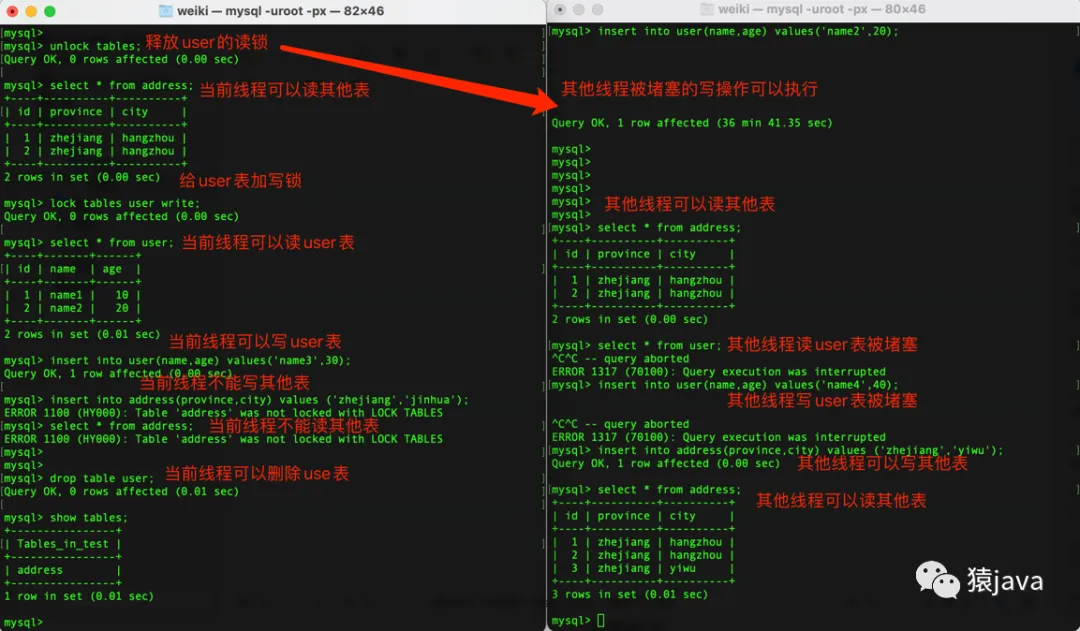 数据更新语句被阻塞,包括 insert, update, delete 语句;数据定义语句被阻塞,包括建表 create table,alter table、drop table 语句;更新操作事务 commit 语句被阻塞;(3) 释放锁