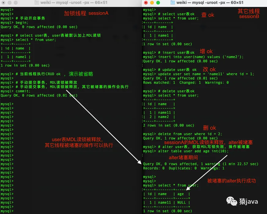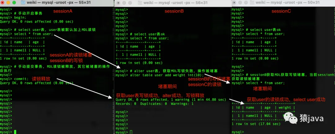 MDL 读锁之间不互斥,也就是说,允许多个线程同时对加了 MDL 读锁的表进行 CRUD(增删改查)操作;MDL 写锁,它和读锁、写锁都是互斥的,目的是用来保证变更表结构操作的安全性。也就是说,当对表结构进行变更时,会被默认加 MDL 写锁,因此,如果有两个线程要同时给一个表加字段,其中一个要等另一个执行完才能开始执行。MDL 读写锁是在事务 commit 之后才会被释放;为了更好的说明 MDL 读锁规则,可以参照下面的顺序执行流和实例图: