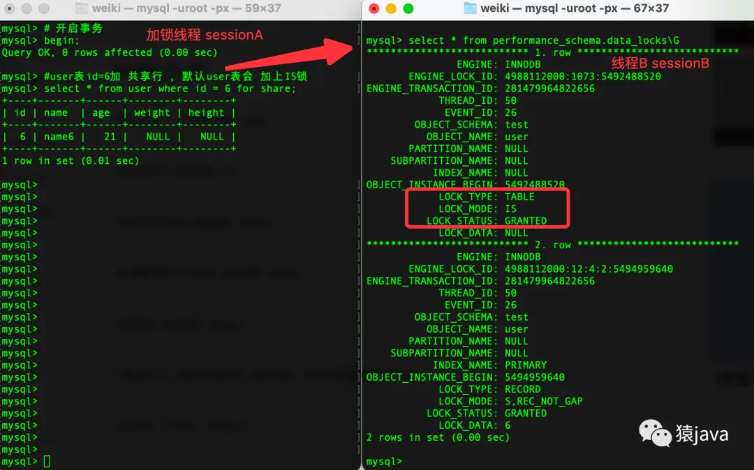 #给 user 表 id=3 的行加共享锁select * from userwhere id = 3 lock in share mode;