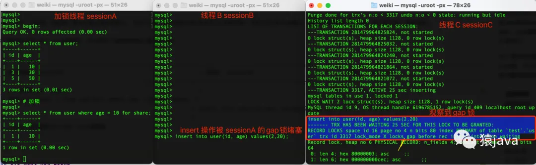 上图中,事务 A(sessionA)在加共享锁的时候产生了间隙锁(Gap Lock),事务 B(sessionB)对间隙中进行 insert/update 操作,需要先获取排他锁(X),导致阻塞。事务 C(sessionC)通过"show engine innodb status\G" 指令可以查看到间隙锁的存在。需要说明的,间隙锁只是锁住间隙内部的范围,在间隙外的 insert/update 操作不会受影响。