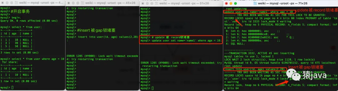 where age = 10 for share;#获取锁失败,insert 操作被堵塞