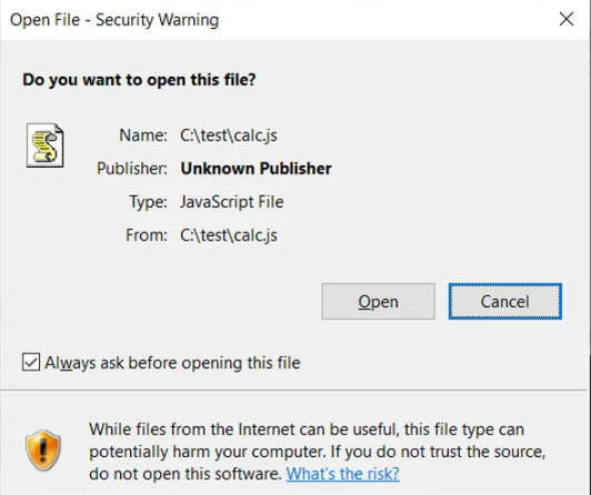 由于JS文件来自互联网,在Windows中启动它会显示Web标记安全警告。