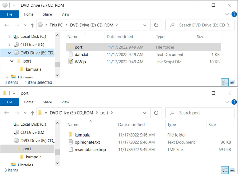 该IMG文件含有一个.js文件(‘WW.js’)、一个文本文件(‘data.txt’)和另一个文件夹,该文件夹含有一个重命名为.tmp文件(‘likeblence .tmp’)的DLL文件,如下所示。源码下载值得一提的是,文件名会随着每起活动而变,所以不应该被认为是静态的。