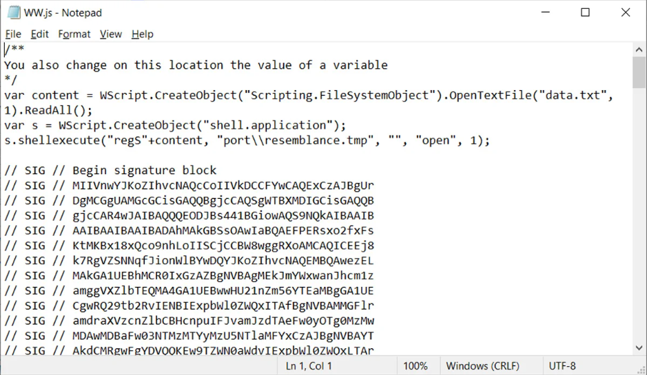想要利用该漏洞,可以使用base64编码的嵌入式签名块对JS文件(或其他类型的文件)进行签名,微软的这篇支持文章有详细描述(https://learn.microsoft.com/en-us/previous-versions/tn-archive/ee176795(v=technet.10)?redirectedfrom=MSDN)。