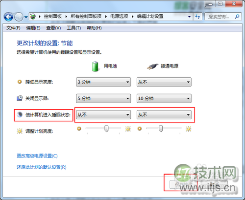 4、用较有方在“使计算机进入睡眠状态”一栏两个设置中,空间选择“从不”,关闭然后点“保存修改”按钮保存设置。