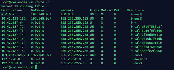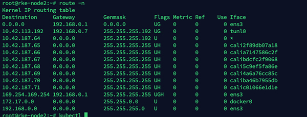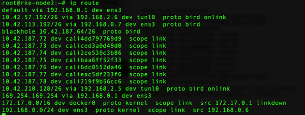 部署完成后默认使用 calico-ipip 的模式,通过在节点的路由即可得知,通往其他节点路由通过 tunl0 网卡出去