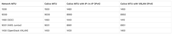 下表列举了,常见几种 MTU 配置下 calico 对应的网卡 mtu 的配置