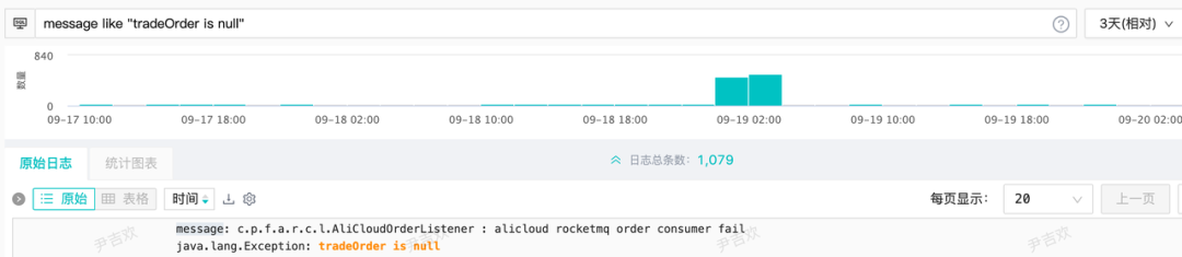 查询订单主表的时候如果为空就会抛一个异常,依赖MQ的重试功能进行下一次重试,这是目前的逻辑。正常情况下订单主表是不可能会出现查不到的情况,在19号凌晨的时候,有一大批订单主表查不到的告警,于是通过关键字去日志平台搜索,如下图所示: