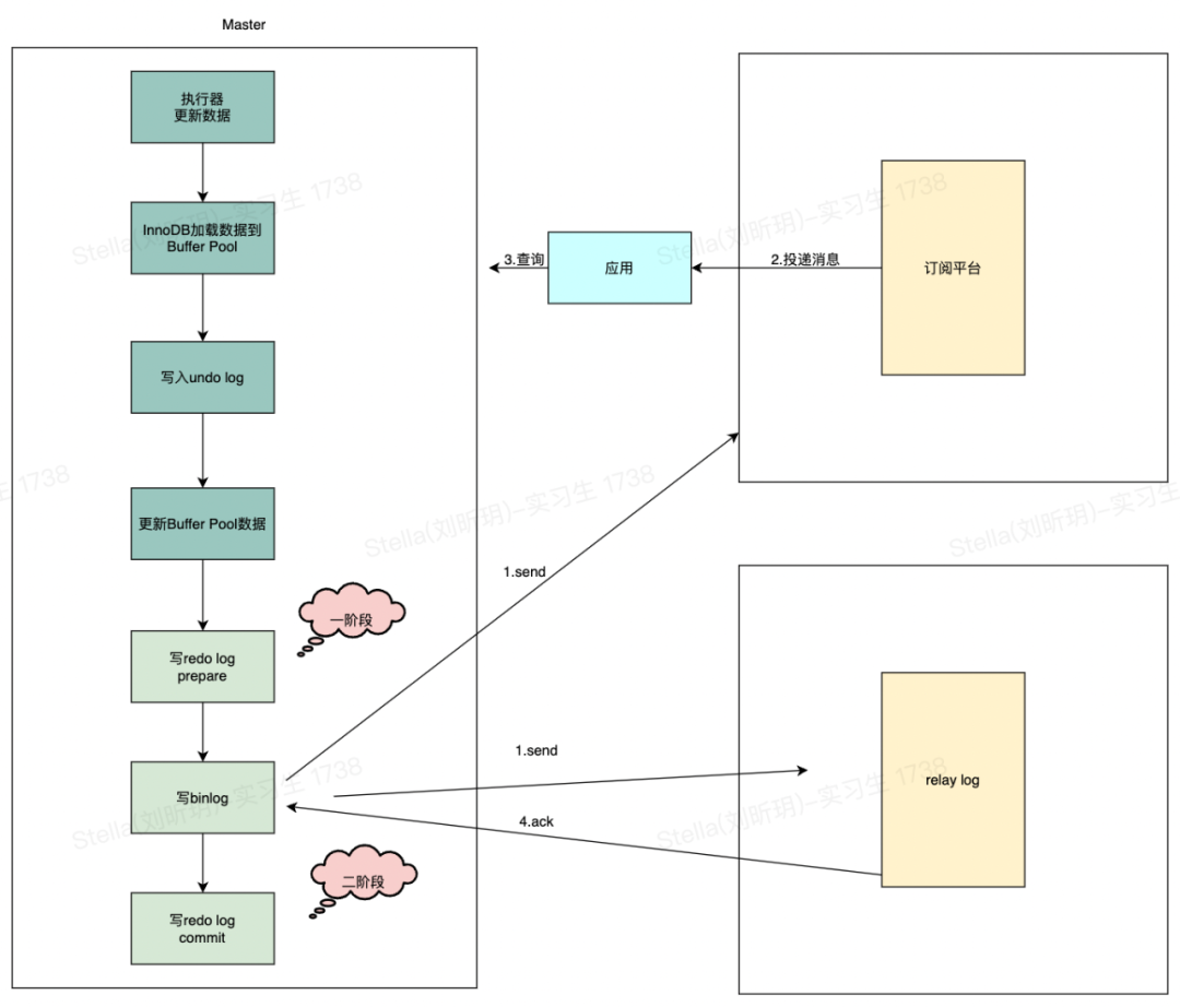 我们目前是用的AFTER_SYNC模式,也就是说binlog写入后,master会等待slave的反馈结果,然后才会commit,这里也就能正常解释我们这个查询不到的问题是什么原因了。原因就是master写完binlog后在等待中,slave收到binlog后,由于IO高,写入relay log比较慢,此时我们的订阅平台也相当于是一个从节点,同样也收到了binlog,然后投递给应用,应用这个时候去数据库查询,因为master还没commit,自然就查不到。